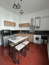 Cuisine équipée : Four, plaques de cuisson, micro-ondes, réfrigérateur, lave-linge et tout le nécessaire de cuisine.